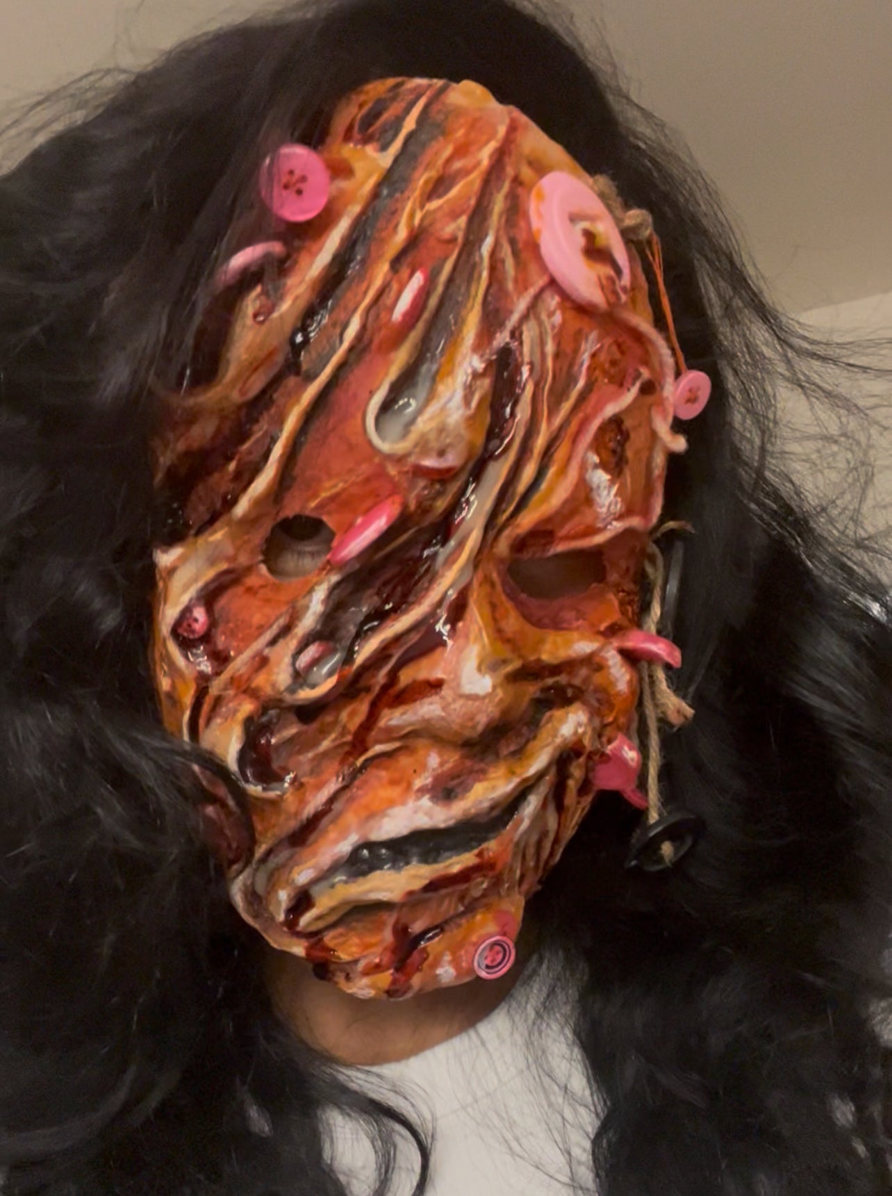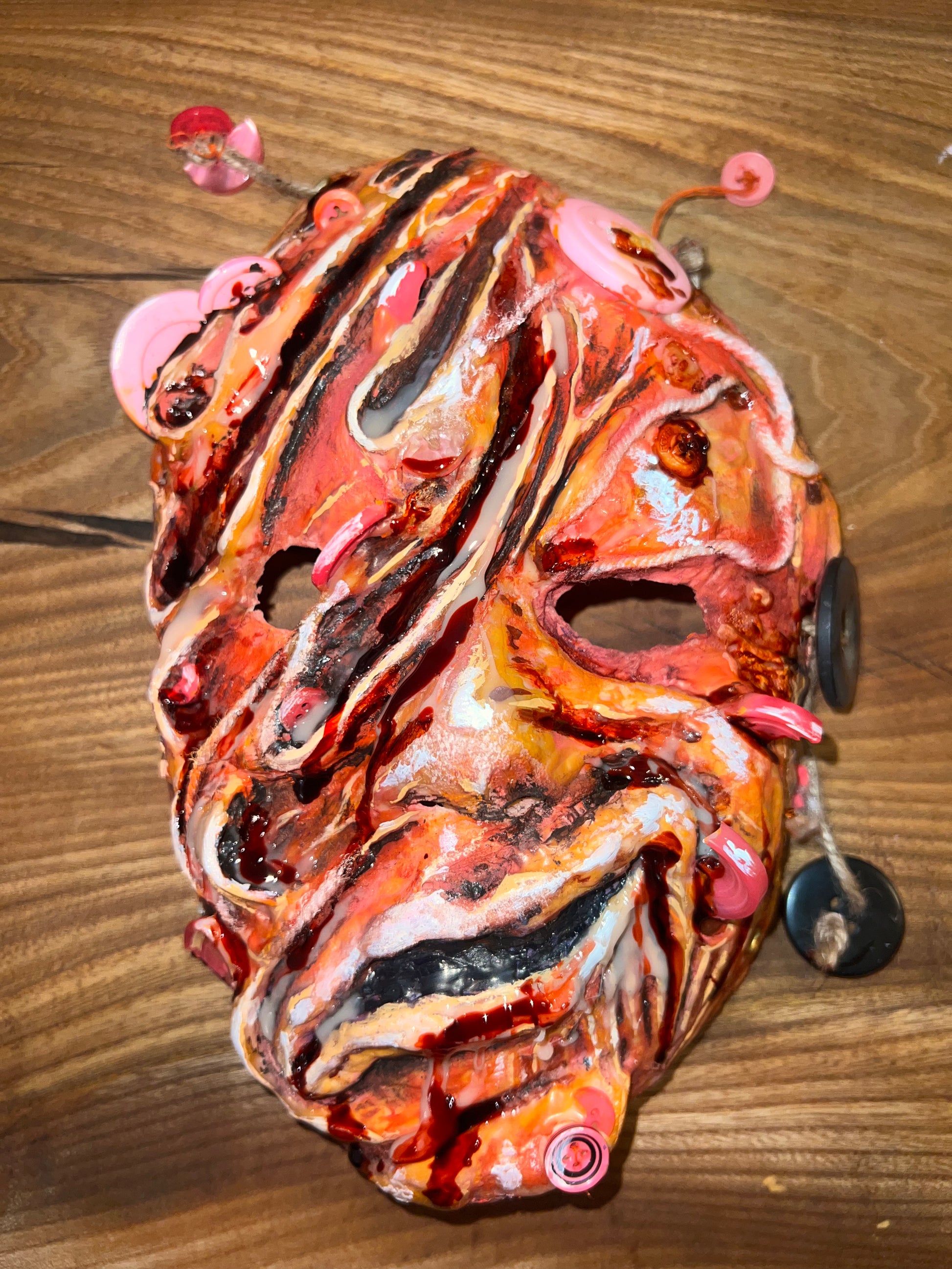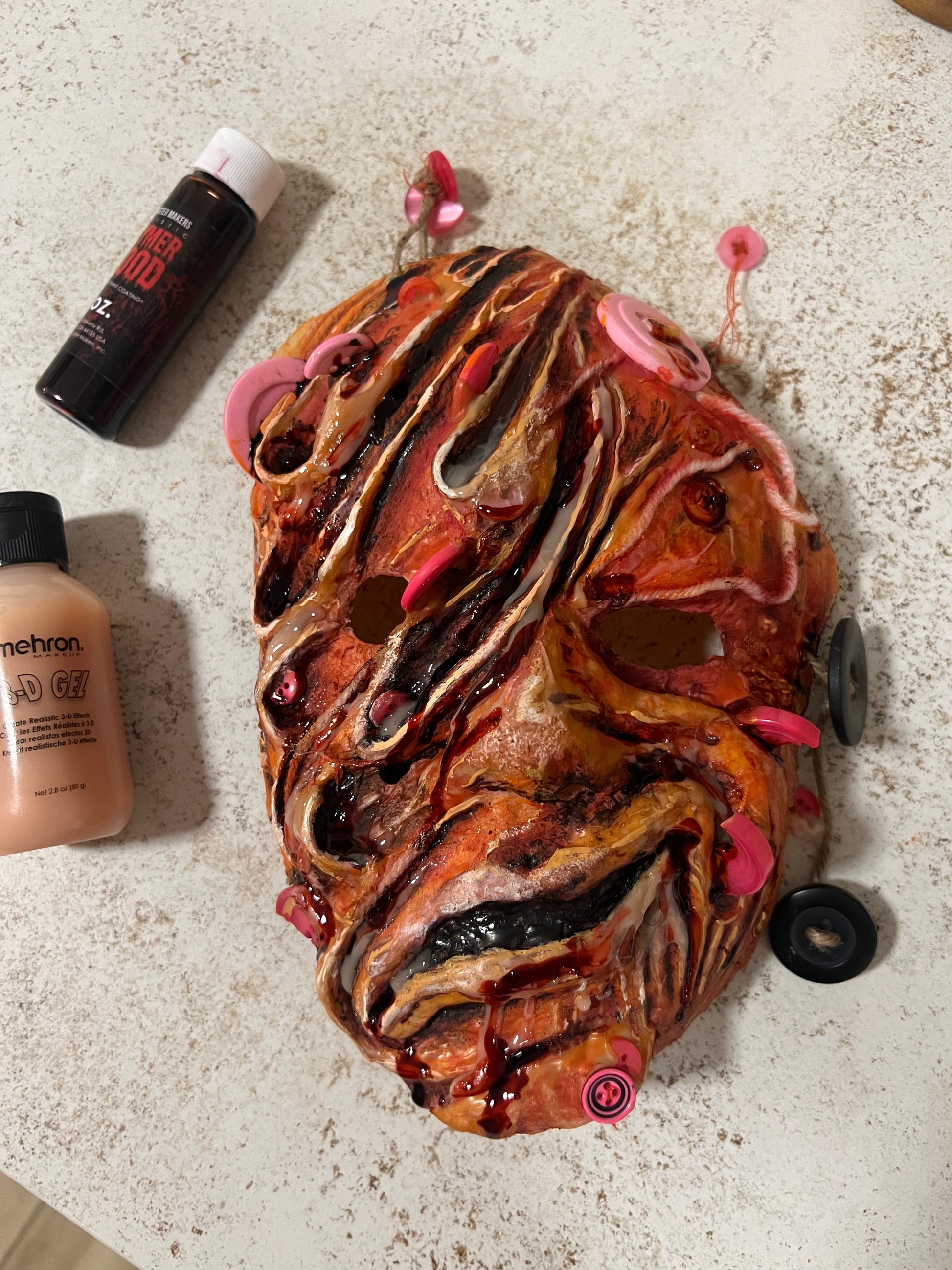 Diese einzigartige Horror-Maske wurde in aufwendiger Handarbeit gefertigt und ist ein echtes Unikat. Inspiriert von der Koumpounophobie (Angst vor Knöpfen) kombiniert sie verschmolzene, blutige Hautstrukturen mit eingearbeiteten Knöpfen und 3D-Gel-Effekten. Das Ergebnis ist ein verstörendes, realistisch wirkendes Kunstwerk, das Albträume garantiert.