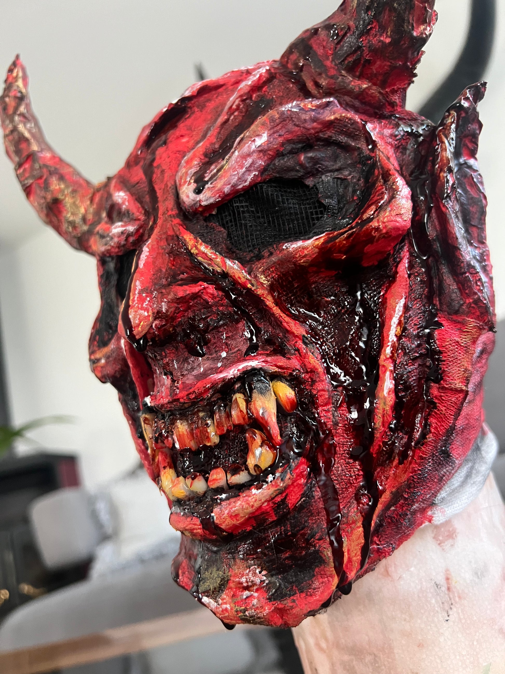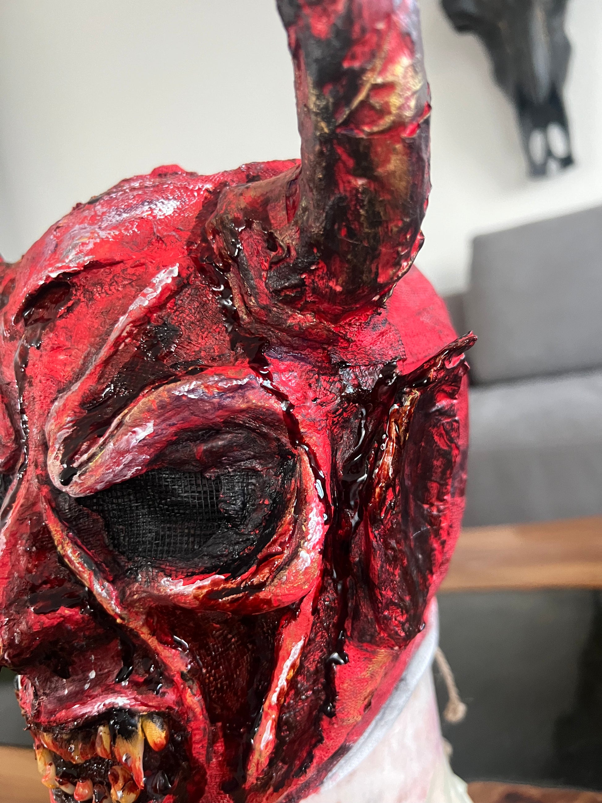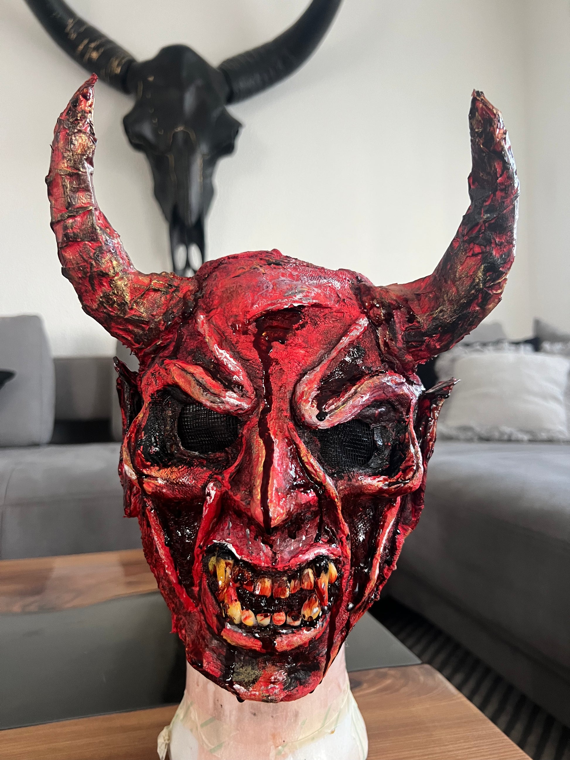 Ein höllisches Kunstwerk handgemachte Dämonenmaske mit furchteinflößenden Hörnern, blutroten Details und schaurigem Realismus. Ein einzigartiges Unikat für Halloween, Horror-Events oder Sammler düsterer Kunst.