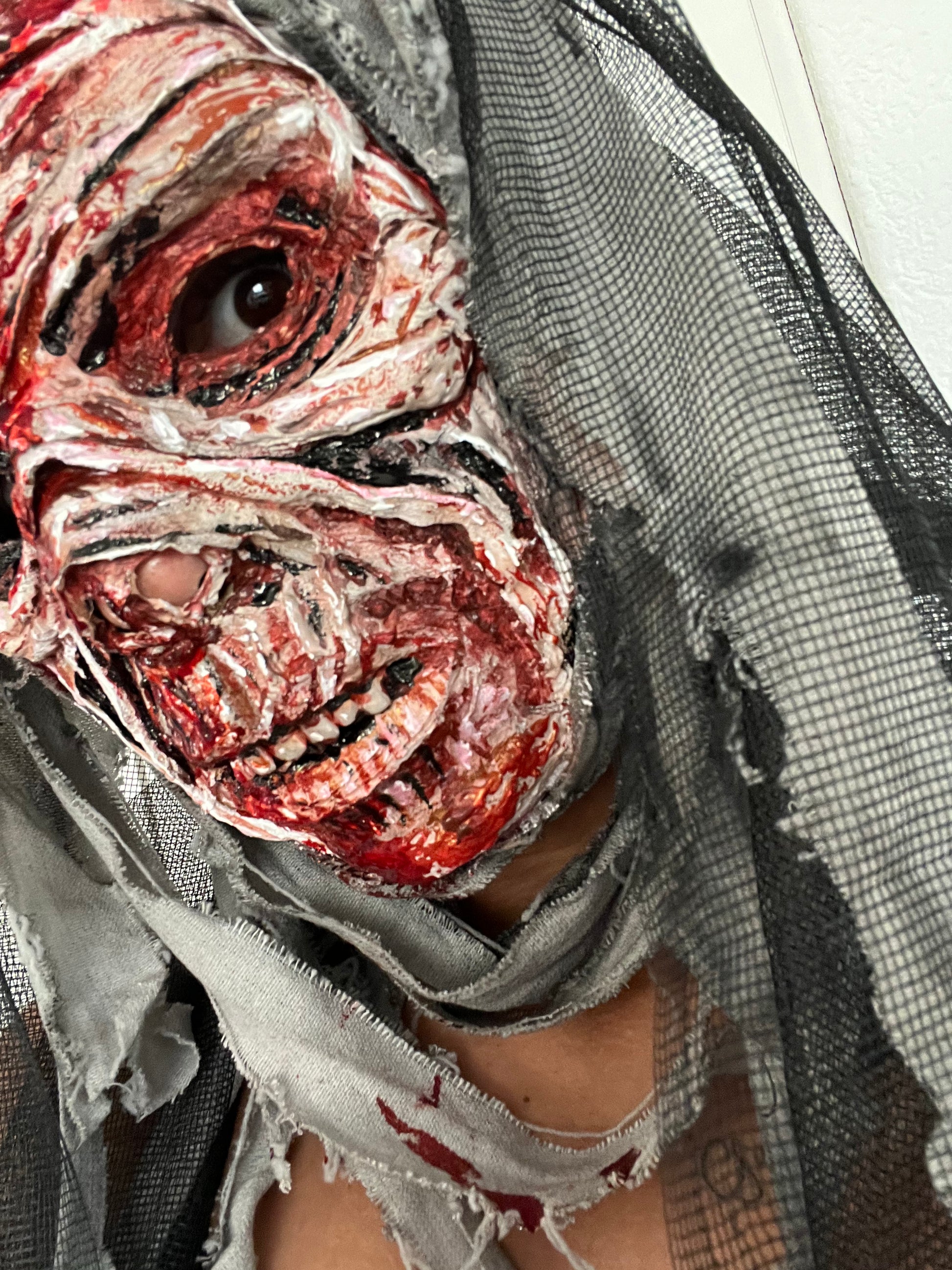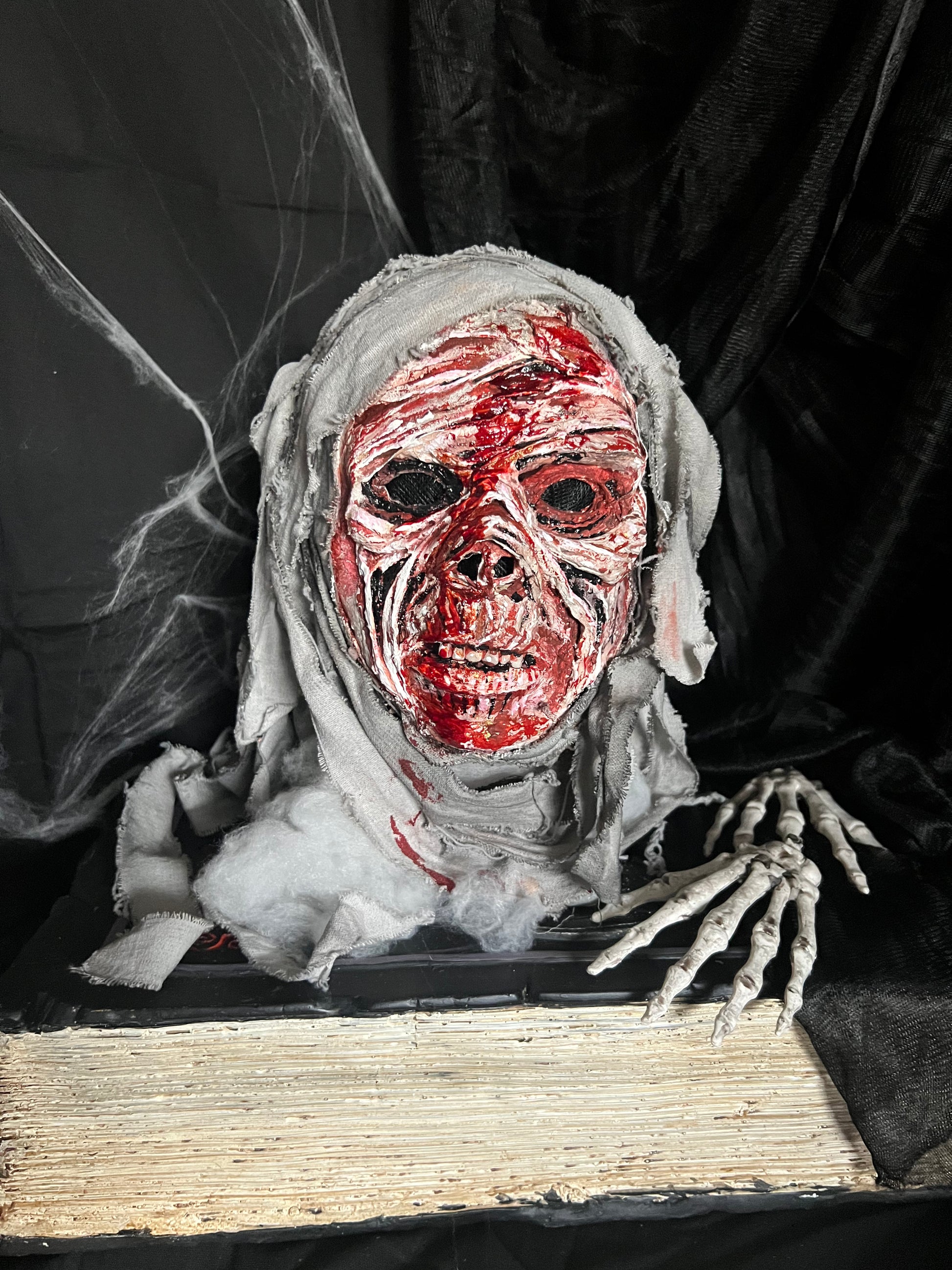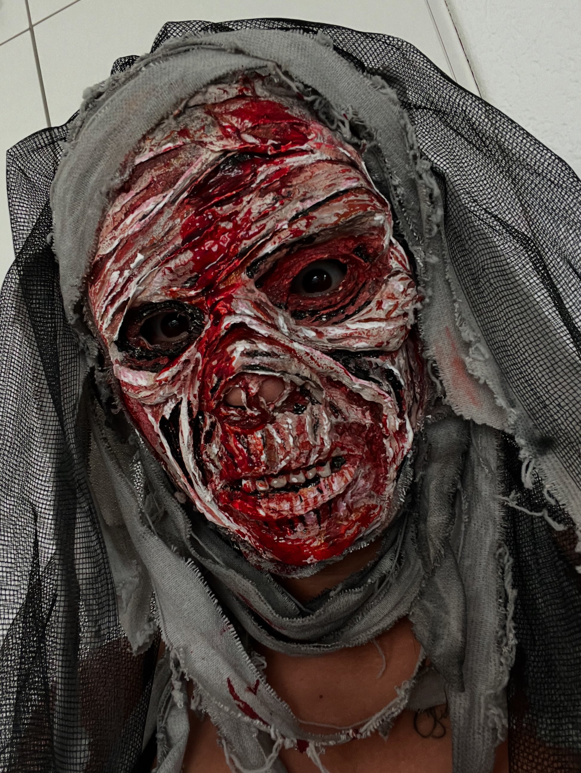 Die Mumie lebt! Eine komplette Kopfmaske, handgefertigt aus hochwertigem Latex, Stoff und Spezialfarben. Jeder Schnitt, jede Falte und jeder Bluttropfen wurde in stundenlanger Handarbeit modelliert. Für diese Maske wurden nur hochwertige Produkte und Farben verwendet ? langlebig, detailreich und absolut einzigartig. Keine Kopie, jedes Stück ist ein Unikat, so erschreckend wie dein schlimmster Albtraum.