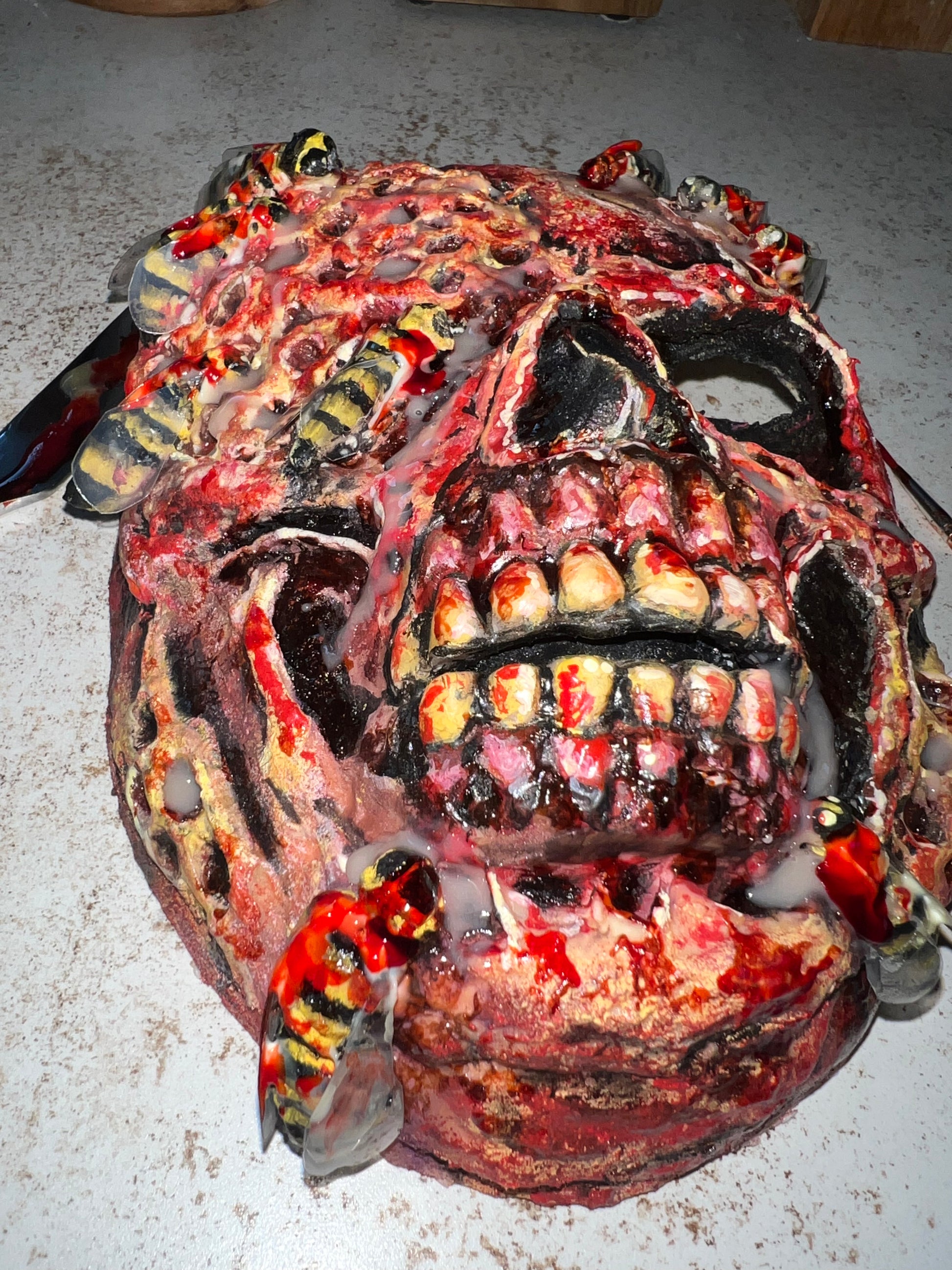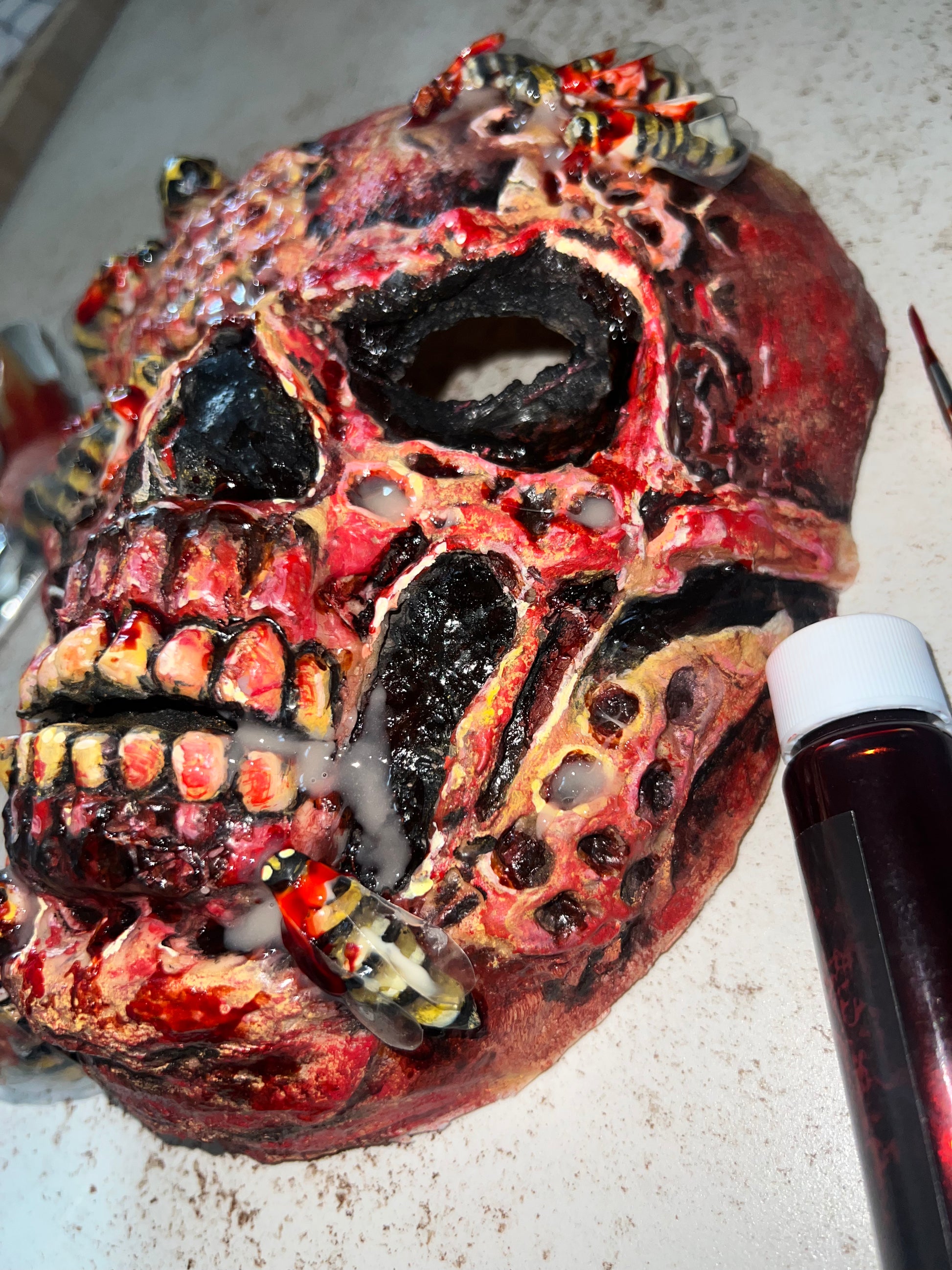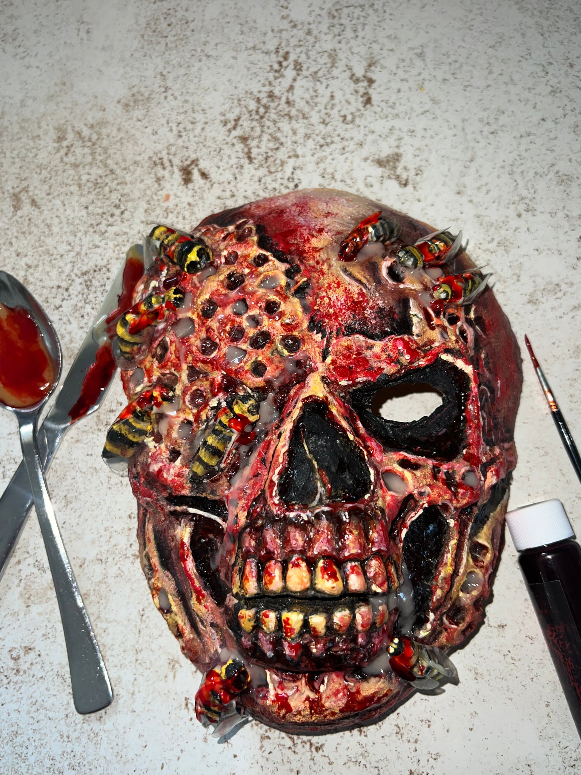 Diese Maske zeigt ein verfallenes Schädel-Design mit Wabenstruktur und kleinen Bienen, dazu realistisch gestaltete Bluteffekte. Jedes Stück ist ein Unikat.