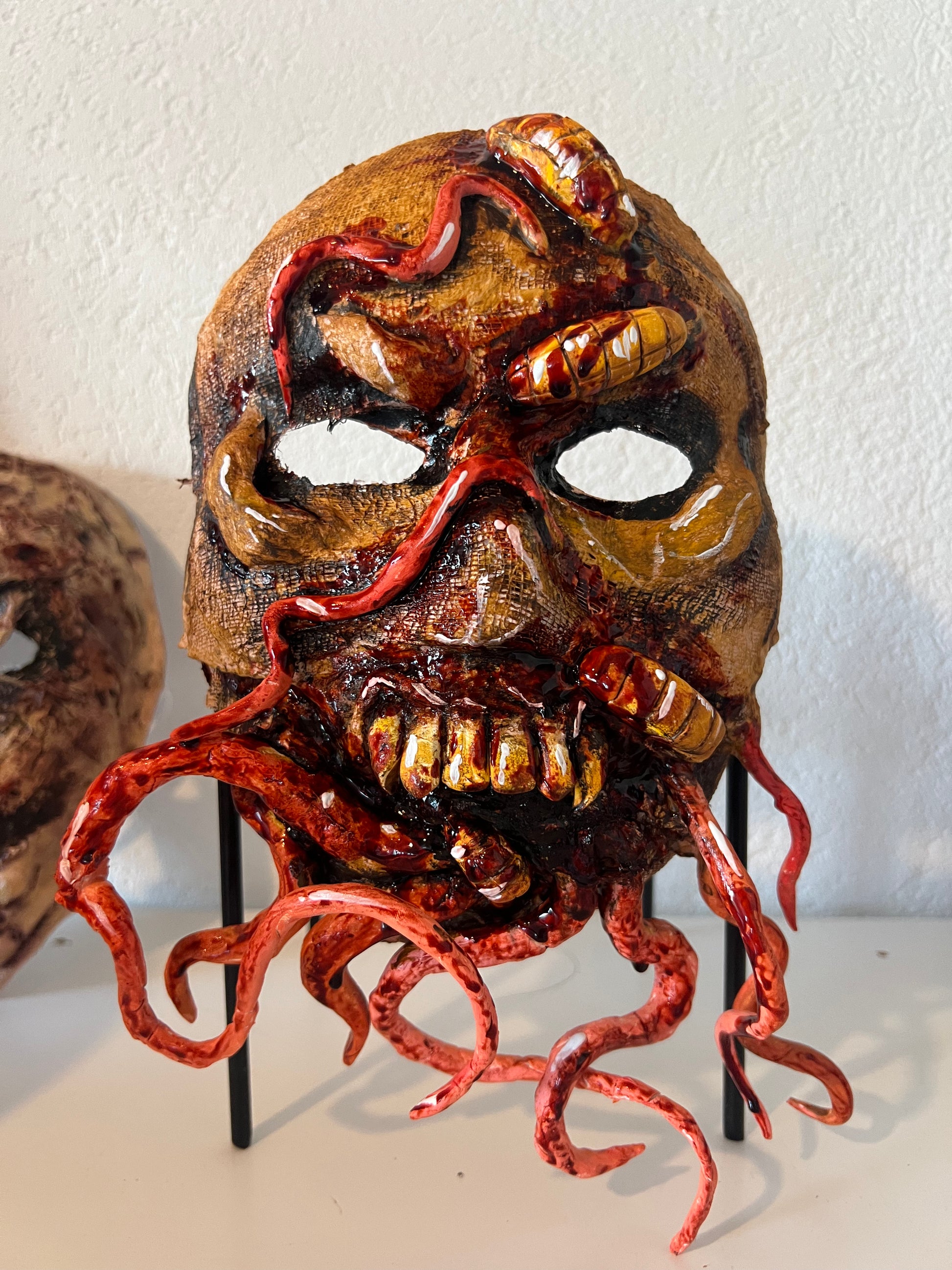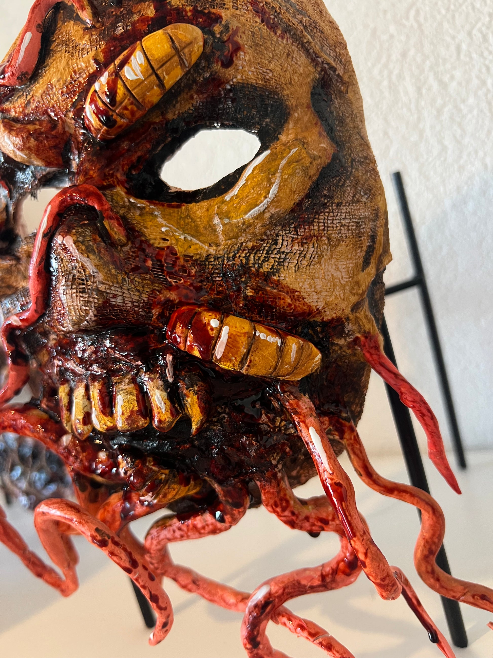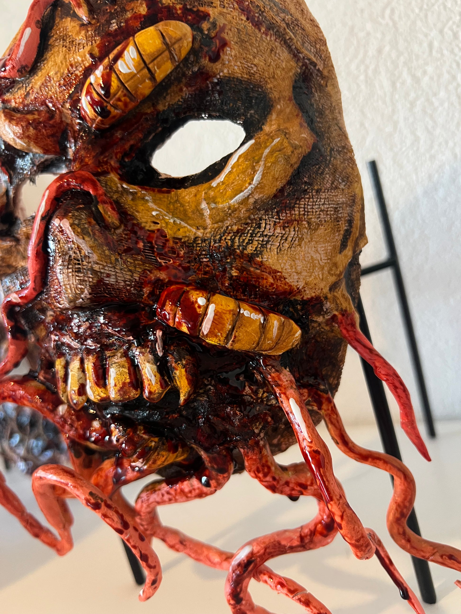 Mit aufwendig modellierten 3D-Strukturen, parasitären Formen und blutigen Details erschafft diese Maske einen verstörend realistischen Look, der sofort alle Blicke auf sich zieht.
